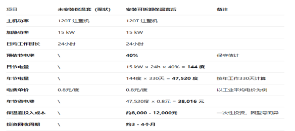 讓我們通過(guò)一個(gè)簡(jiǎn)單的例子來(lái)算一筆賬:某 120T 注塑機(jī),加熱功率 15kW,日均工作 24 小時(shí)。未安裝保溫套時(shí)無(wú)節(jié)電效果,安裝可拆卸保溫套后預(yù)估節(jié)電率 40%,日節(jié)電量 144 度,年節(jié)電量 47520 度,年節(jié)省電費(fèi) 38016 元;保溫套投入成本約 8000-12000 元,投資回收周期約 3-4 個(gè)月。